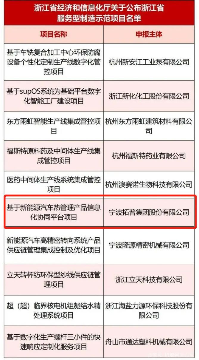 在省经济和信息化厅公布2022年度服务型制造示范企业(平台、项目)名单(第六批)中,优德普服务汽配客户宁波拓普集团股份有限公司基于新能源汽车热管理产品信息化协同平台项目,凭借创新的数智化成果以及先进制造和现代服务深度融合,从众多参选企业中脱颖而出,荣登榜单!