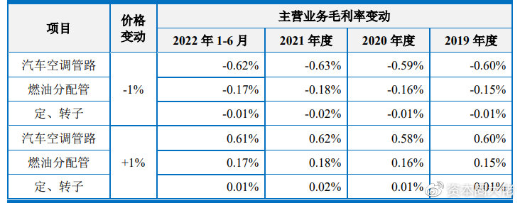 报告期内,在假设其他影响因素不变的情况下,汽车空调管路销售价格下降1%,则2019年、2020年、2021年和2022年1-6月,公司主营业务毛利率将分别下降0.60%、0.59%、0.63%和 0.62%。