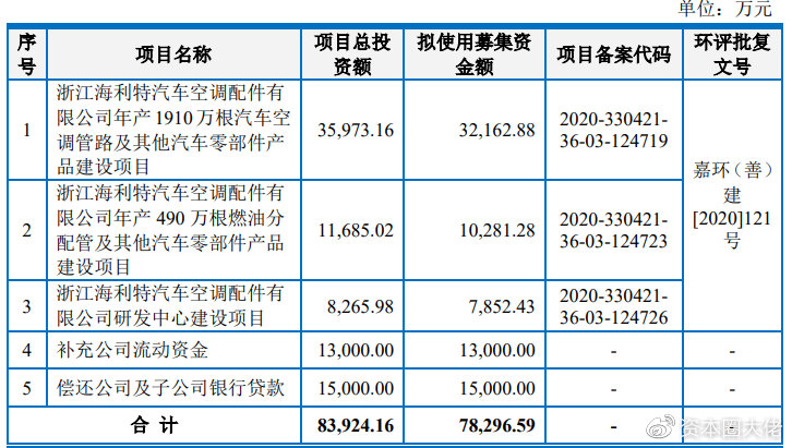 上海汽配此次募资金额7.83亿元,其中用于年产1,910万根汽车空调管路及其他汽车零部件产品建设项目资金约3.22亿元,年产490万根燃油分配管及其他汽车零部件产品建设项目约1.03亿元,研发中心建设项目约0.79亿元,补充流动资金、偿还银行贷款2.8亿元。