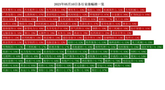 今日涨幅居前的行业有:汽车整车(4.65%)、汽车配件(2.82%)、电气设备(2.35%)、摩托车(1.68%)、橡胶(1.38%)、机械基件(1.31%)、专用机械(1.28%)、广告包装(1.28%)、文教休闲(1.07%)、家居用品(1.06%)。