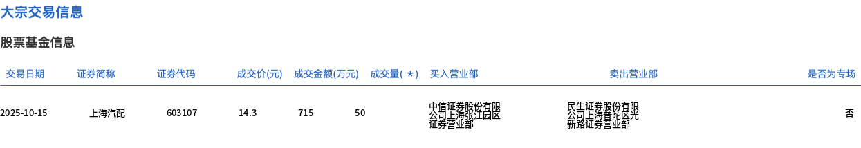 10月15日,上海汽配大宗交易成交50万股,成交额715万元,占当日总成交额的15.55%,成交价14.3元,较市场收盘价15.74元折价9.15%。