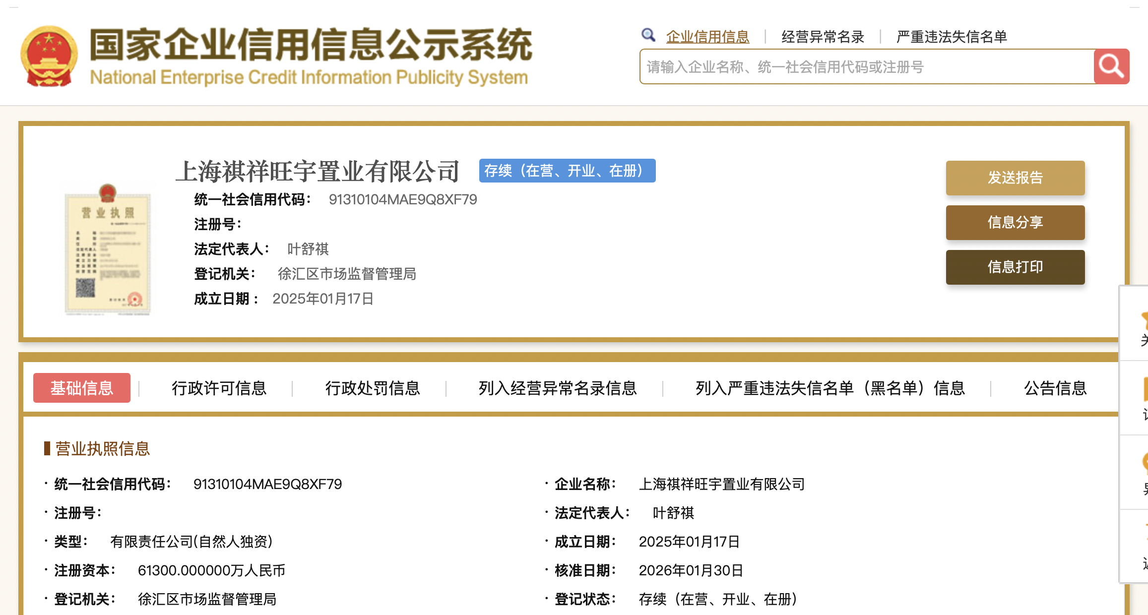 祺祥旺宇置业成立于2025年1月17日,经营范围包括:房地产开发经营;住宅室内装饰装修;建设工程施工等,法人代表为叶舒祺。目前,公司由叶舒祺100%持股。